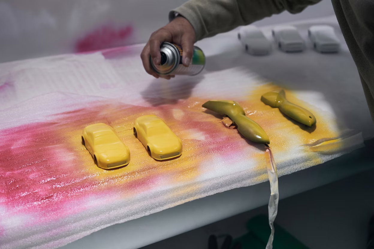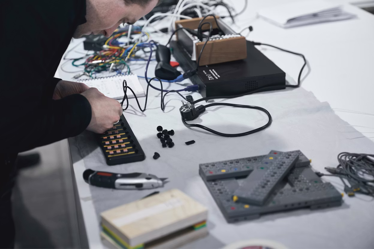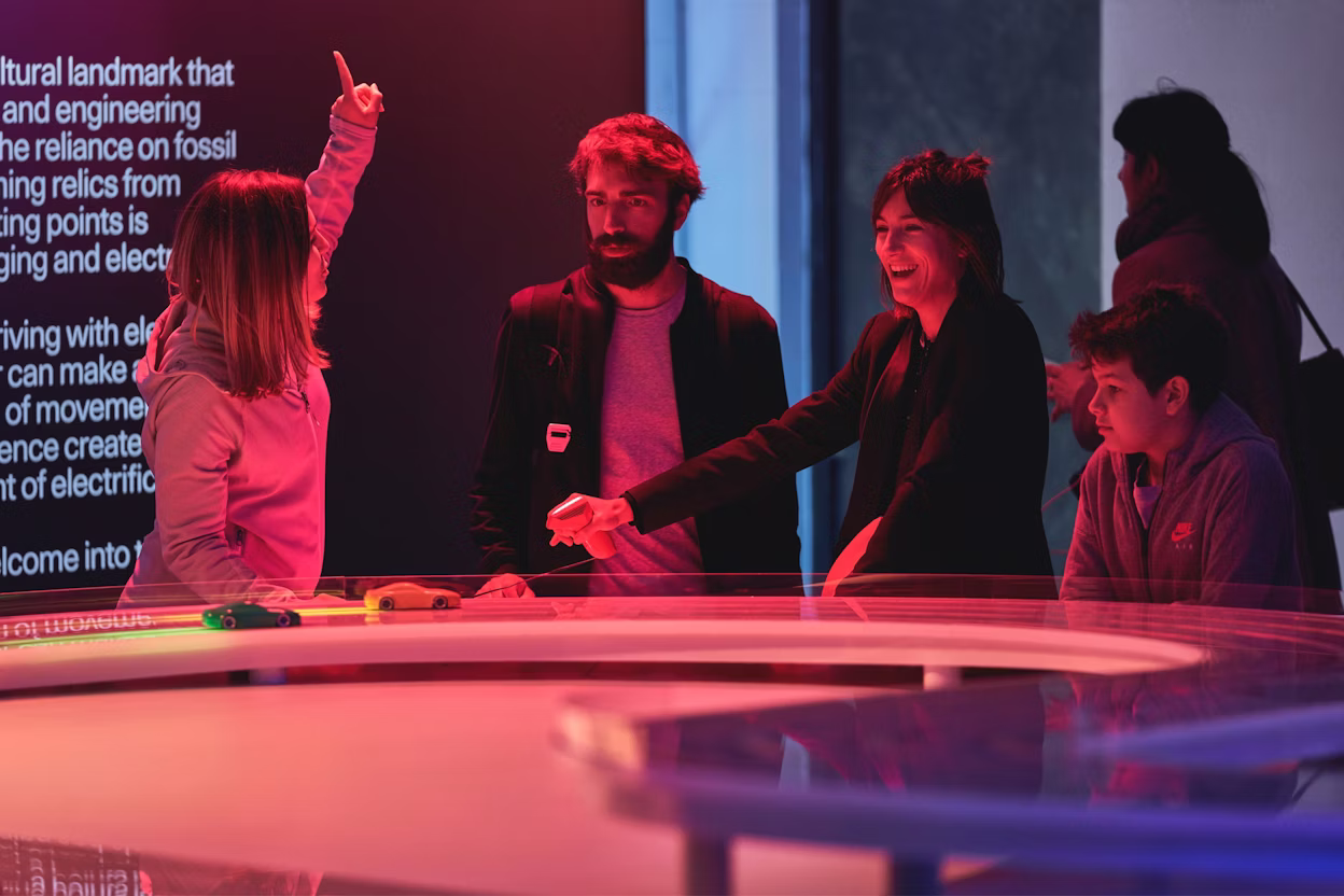 步入展厅后,参观者可以看到第二件作品,那是一个遥控玩具汽车轨道:遥控模型车的控制器还可用于控制背景音乐中的不同乐器,以及轨道平台每个角落上方的灯光。按下遥控车加速踏板,向音乐中添加一种乐器(或调整音调),就可以上演一台迷你灯光秀。这件装置可以让每一个参观者都参与到互动中来。无论是一个动作、一束光线,还是一个声音,参与者越多,感官体验就越棒,它“点亮”了驾驶电动汽车的乐趣。